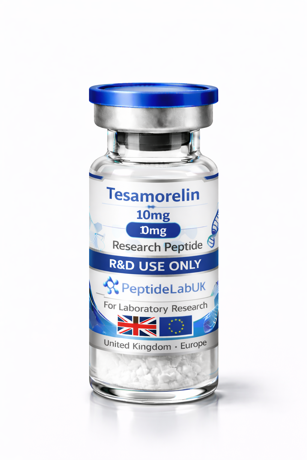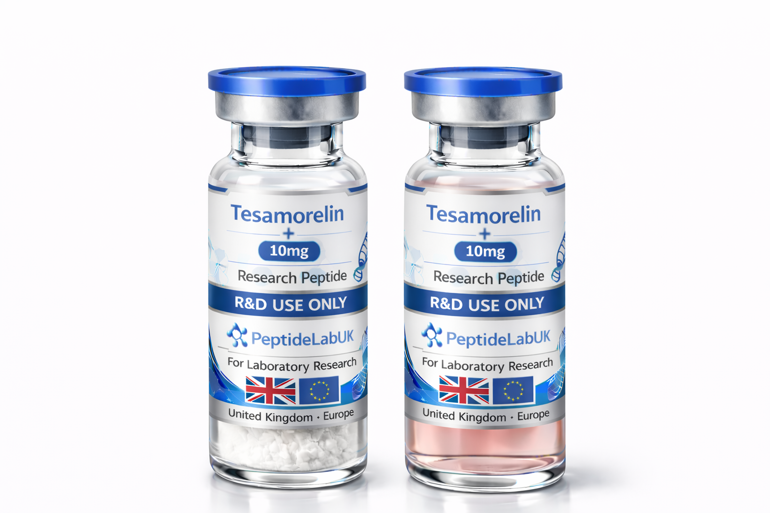 At PeptideLabUK.co.uk, Tesamorelin 10mg is supplied in two laboratory-ready formats: